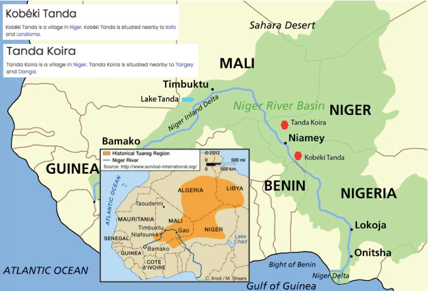 I have discovered the word “Tanda” just south of the Sahara, at the borderline of the operational area of the Tuareg tribe. Two of them are villages, the third is a lake. If the African word “Tanda” had had a different meaning than in India, there were no linguistic match with Indian Banjaras. But as they are villages at the edge of the Sahara along the Niger River,it all makes perfect sense. Tanda is a place where long distance nomadic trading communities used to halt and set up a camp. Later in the post-Nomadic age, this word changed to mean a gypsy village.